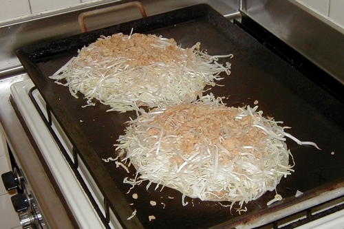 ・キャベツ、もやし、天かす(イカ天)を乗せる